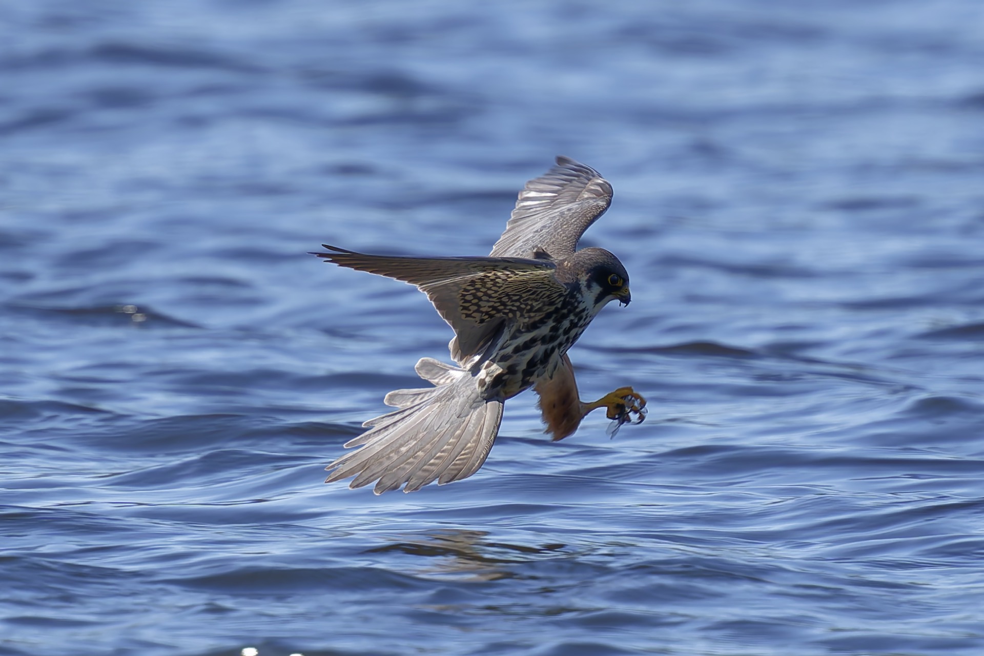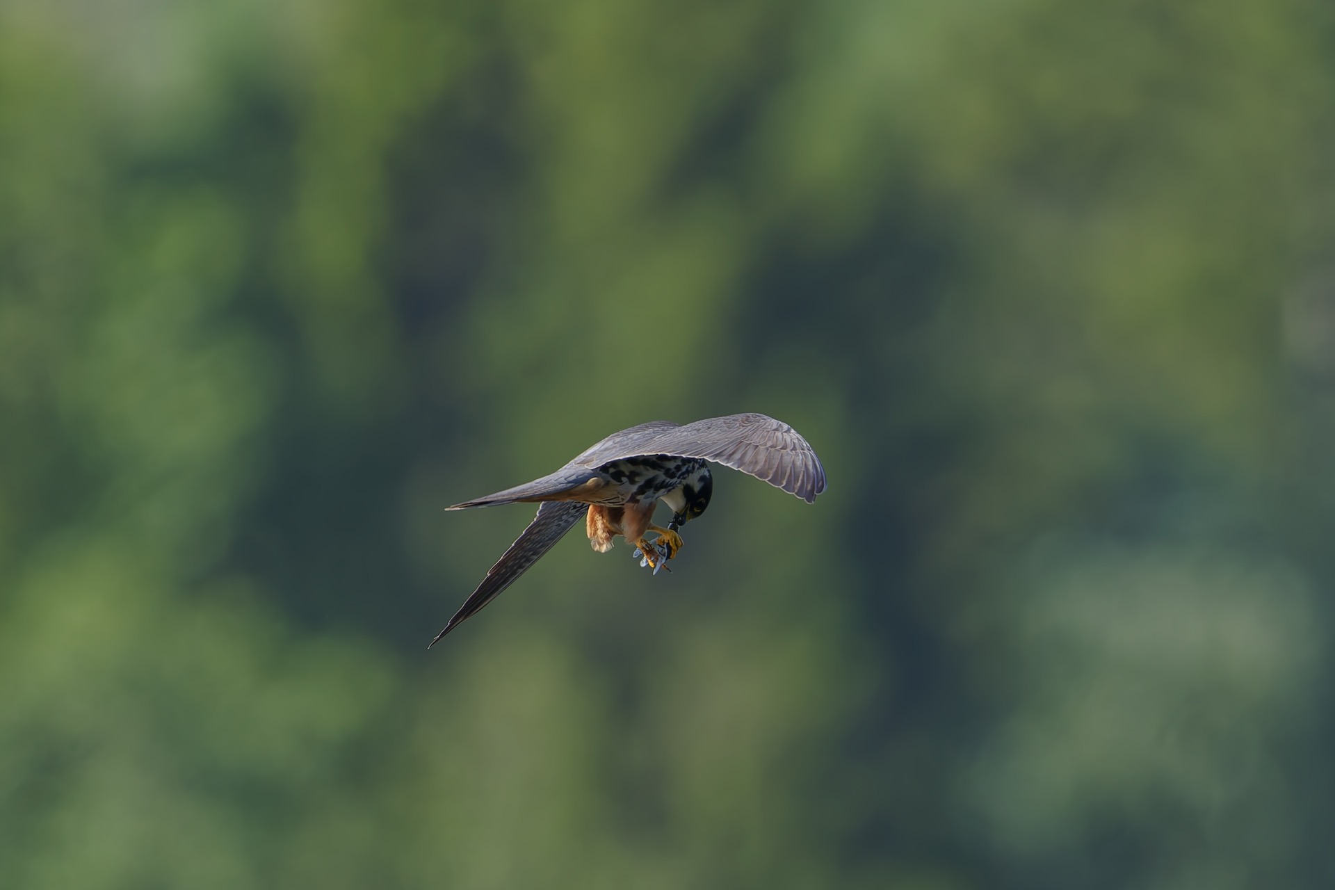 The Eurasian hobby has established nests near a lake in proximity to my residence. Its diet consists primarily of small birds and flying insects such as dragonflies. Observing the Eurasian hobby hunting and consuming dragonflies is an awe-inspiring experience. Their remarkable speed of movement makes it challenging to capture their movements on camera.