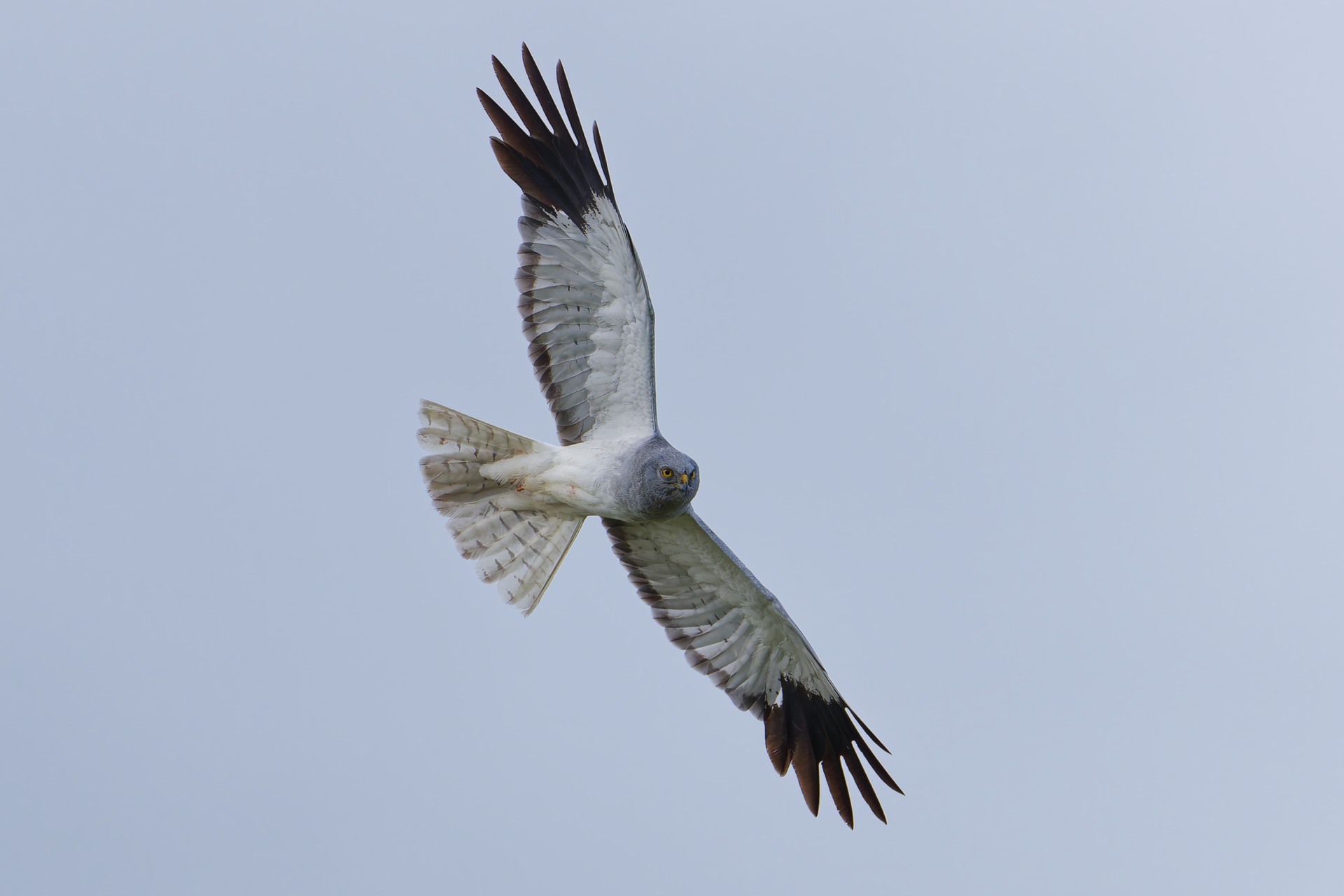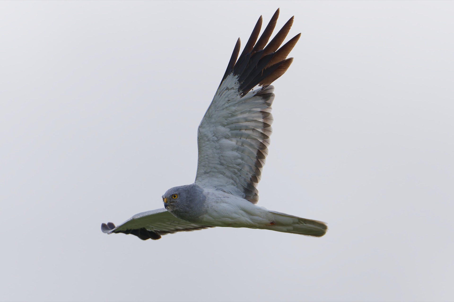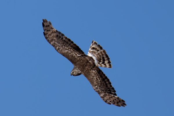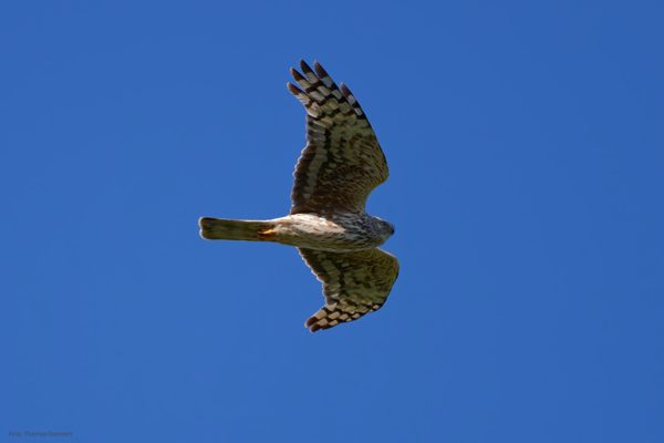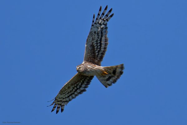 The male Hen harrier is a striking grey and white bird with black wingtips. The female is brown with white upper tail coverts. The female is a little bit bigger than the male, which is normal among the birds of prey.