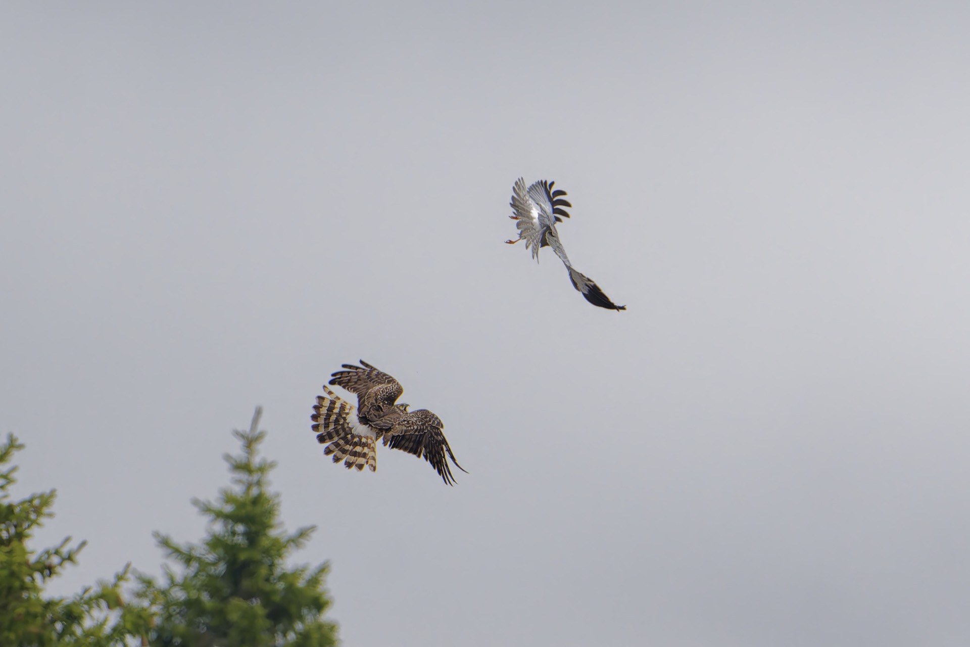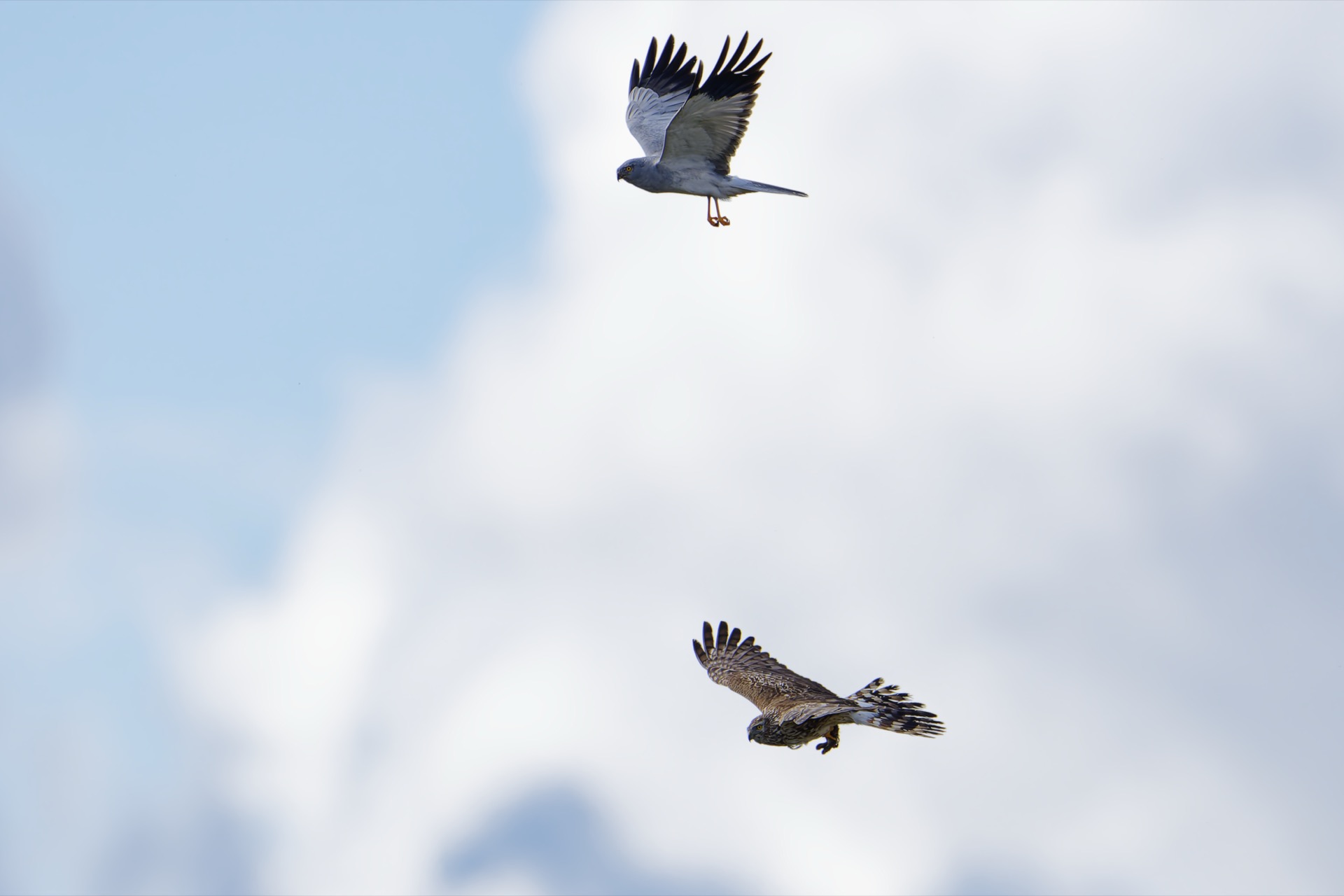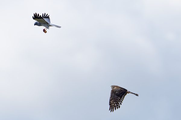 This photograph depicts the couple prior to the commencement of their nesting season. It is presumed that this behavior serves as an integral component of the bonding ritual observed by the Hen harrier.