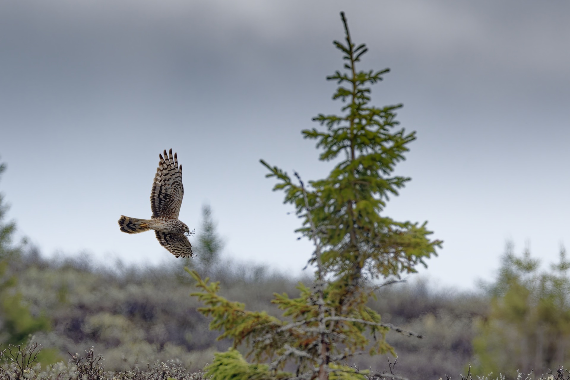In late May 2024, I observed a female Hen harrier diligently constructing a nest. Approximately mid-June, I observed the male returning with prey, which he subsequently presented to the female.